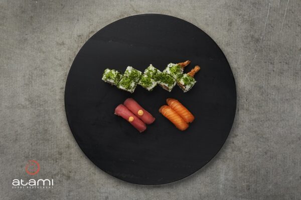 (20stk.) 1 Lækker laks (8 stk.), 1 Stor tempura roll (6 stk.) 2 Nigiri laks, 2 Nigiri spicy tun, 2 Nigiri reje.