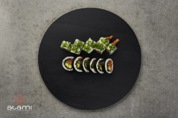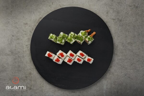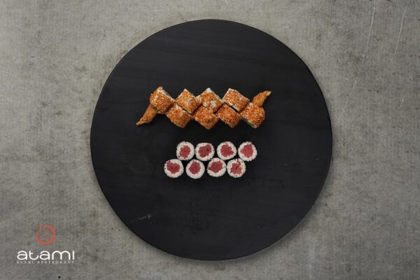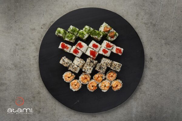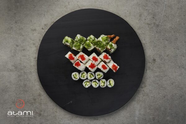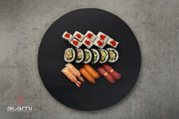 (42stk.) 1 Odense (8 stk.), 1 Lækker laks (8 stk.), 1 Hosomaki spicy tun (8 stk.) 1 Stor tempura roll (6 stk.), 6 Stor laks roll (6 stk.) 2 Nigiri laks, 2 Nigiri reje, 2 Nigiri tun.