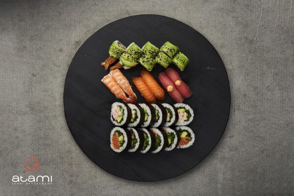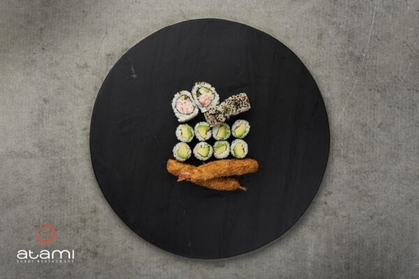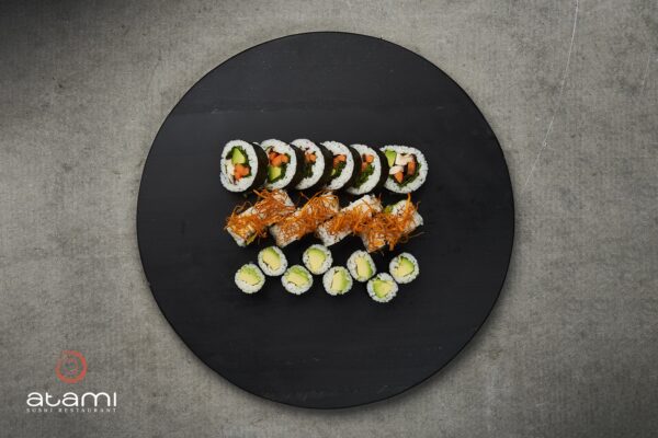(83stk.) 1 Hosomaki laks (8 stk.), 1 Hosomaki tun med forårsløg (8 stk.) 1 Califonia (8 stk.), 1 Spicy laks (8 stk.), 1 Hot ebi (8 stk.) 1 Store Laks roll (6 stk.), 1 stor Tempura roll (6 stk.), 1 Stor Kylling roll (6 stk.) 5 Nigiri laks, 5 Nigiri tun, 5 Nigiri reje, 5 Nigiri tofu, 5 Nigiri lakstataki.