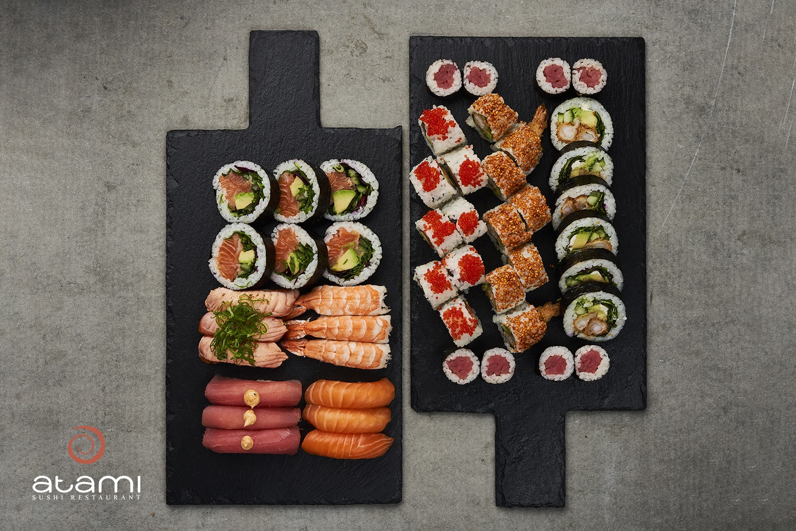 (48stk.) 1 Hosomaki spicy tun (8 stk.) 1 Hot ebi (8 stk.), 1 Lækker laks (8 stk.) 1 Stor Laks roll (6 stk.), 1 Stor Tempura roll (6 stk.) 3 Nigiri spicy tun, 3 Nigiri laks med hvidløg. 3 Nigiri reje , 3 Nigiri laks tataki