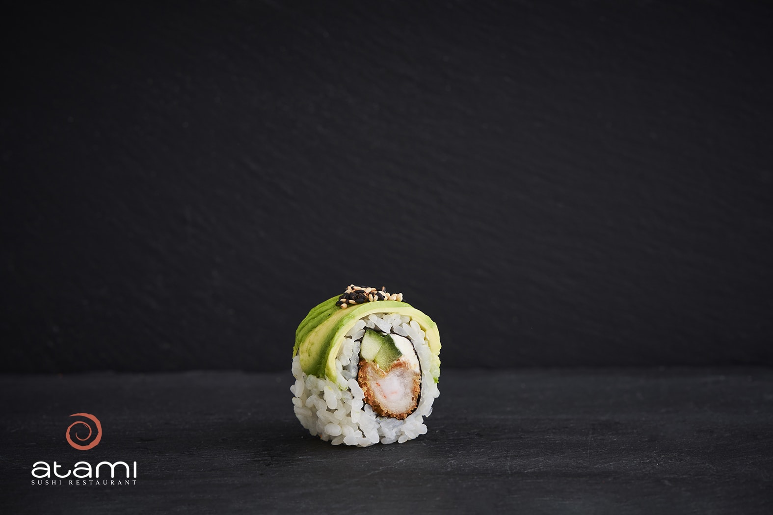 Tempura reje, Agurk, Flødeost, Toppet med avocado, Sesam og Teriyaki sauce (8 stk.)