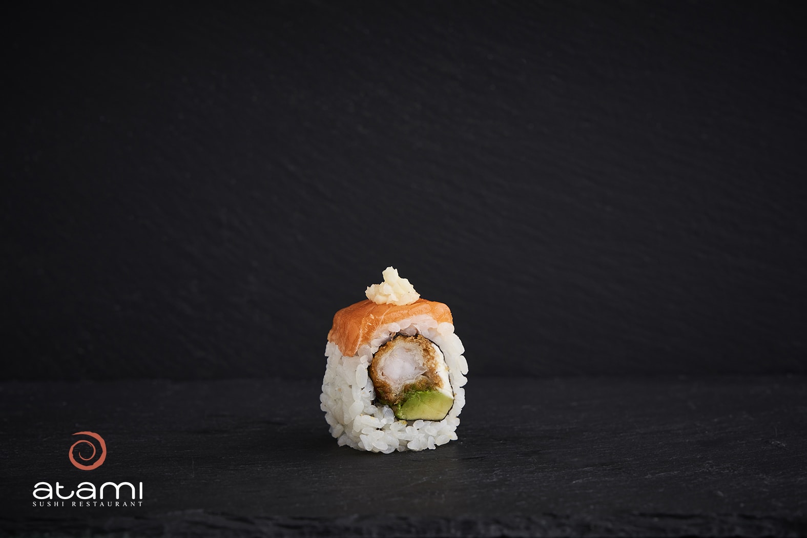 Tempura reje, Avocado, Flødeost, Toppet med laks og Hvidløg (8 stk.)