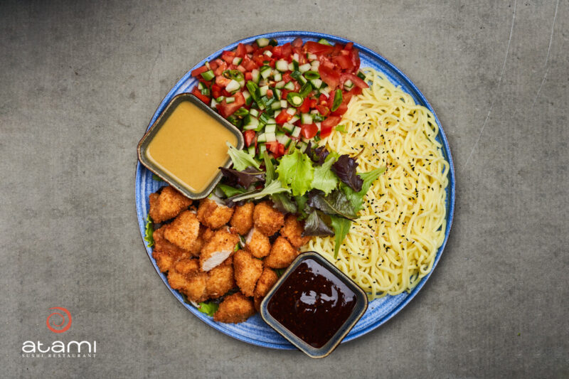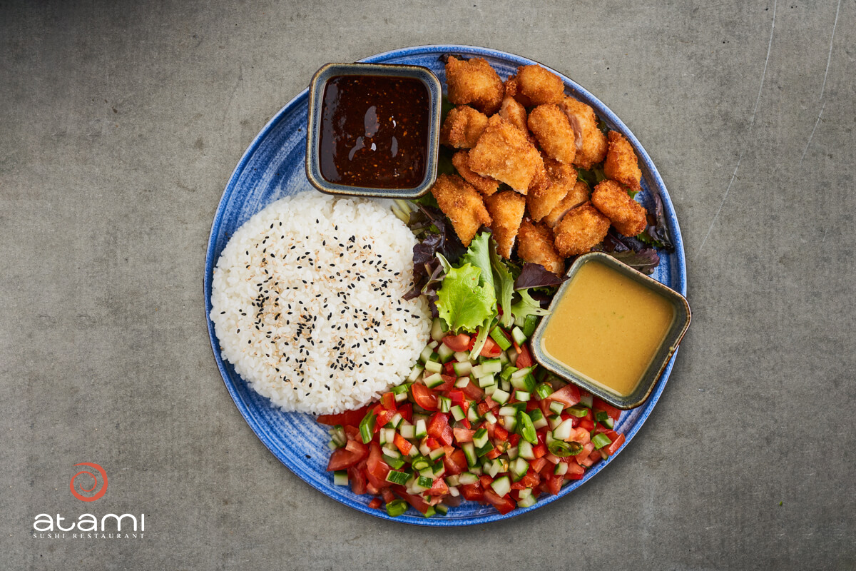 Tempurakylling med karry sauce og Salat. Vælg mellem ris eller nudler